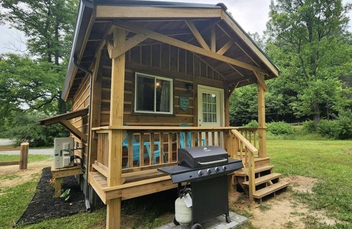 Hidden Gem Cabins welcomes you to the Wanderer (Cabin 2). This is a brand new, comfortable wood cabin and peaceful retreat. Perfect for two people! Located alongside a babbling brook that can be heard while relaxing on your back porch, our 4 cabins are located in a quiet, wooded area. You will be renting the Wanderer (Cabin 2) which is a cozy studio cabin that sleeps two people in a comfortable pillow top queen size bed. The space has one full size bathroom with a shower and a kitchenette with a full-size refrigerator, toaster, griddle, drip coffee maker, and a microwave. There is a propane gas grill out back of your cabin as well as a fire pit to enjoy with complimentary firewood and we invite you to relax in front of the Roku Smart TV or on your private back porch. Sip your morning coffee as you take in the beautiful scenery around you and enjoy visits from the friendly deer and rabbits that live on the property. All linens and towels provided, along with a starter supply of toilet paper, shampoo/conditioner/shower gel. Ice cold air conditioner, cozy heat and Wi-Fi Internet included. And no need to take dirty clothes home with you...there is a coin-operated laundromat on the premises. Our cabins DO NOT ALLOW PETS.