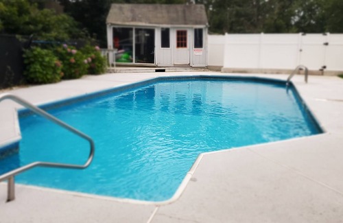 the fenced in back yard invites you to swim, lounge, and relax every minute of your stay! the heated pool is open from memorial day to october (new england weather permitting) Grab some pool noodles and floats from the pool house for the kids and throw some steak on the 2-in-1 charcoal/propane BBQ grill. In the evening, gaze at the stars while you relax with your family by the fire pit.