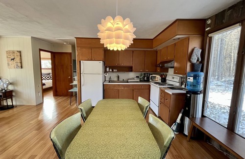the cottage has two bedrooms (both with queen size beds), one full bathroom with shower/tub, and a great room consisting of kitchen, dining and living areas There is a woodstove fireplace in the center of the great room. Hardwood bamboo floors and modern Mid-Century furnishings, and High-Speed Wifi Internet throughout the cottage.