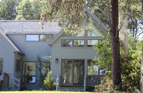 This comfortable house provides up and downstairs amenities. The master bedroom with bath is on the ground floor; the other full bedroom and sleeping areas are upstairs. Thel loft with great views that can be used for additional sleeping space or relaxation. TV and Wireless Internet connectivity. Large deck oversees the landscaped yard, pond and ocean. Within walking distance of private beach. Outside shower and grill.