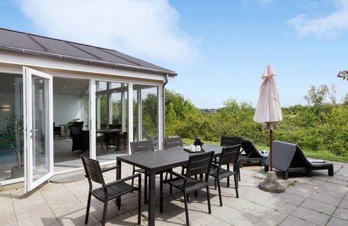 arrive and enjoy the location on a hill overlooking ebeltoft bay Step inside and immediately feel at home. The interior impresses with its classic style and yet cosy charm, complemented by a wood-burning stove for cosy evenings and a sauna for soothing relaxation. The swimming pool promises refreshment and fun for the whole family and, thanks to the large window front, combines indoor swimming with sunbathing in the garden. The spacious interior of the holiday home is perfect for social gatherings.