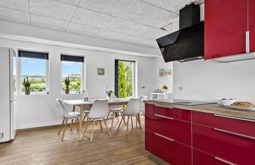 this beautiful holiday home exudes genuine danish cosiness The light-flooded living area with its large windows is the ideal place to get together, play and relax. The dining table offers plenty of space for family meals, while the cosy sofa area invites you to relax. Enjoy the view of the garden, where your children can play and run around, or end the day with an exciting film.