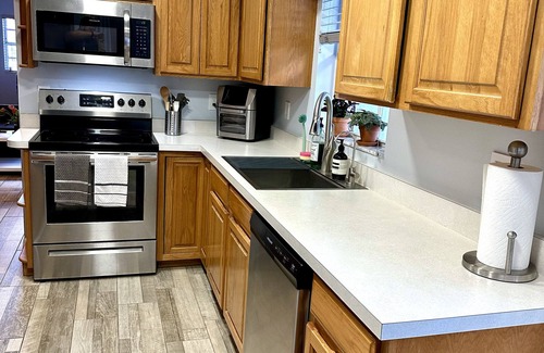Escape to our 2-bed midcentury gem in Historic Zephyrhills! Relax in our Santorini-inspired home, minutes from bars and parks. Sofa bed for extra guests’ flexibility, fully stocked kitchen with coffee and spices, and touch-free entry for a seamless stay. Explore nearby attractions: Zephyr Park, Sky Dive City, Dade City, Wesley Chapel, and Tampa. Easy drive to Busch Gardens, Tampa Premium Outlet, Disney World, and more. your ideal retreat, blending style, comfort, and convenience!