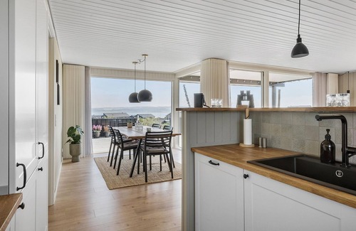 imagine waking up in the morning in a bright holiday home with the first rays of sunshine bathing the limfjord in golden light This well-equipped holiday home not only offers you a fantastic view, but also an inviting, modern atmosphere that invites you to feel at home. Enjoy the ambience with soft and bright colours and go about your everyday holiday life in the open-plan living space with kitchen, living room and dining area. Look forward to an evening watching TV by the fire and stretching out on the sofa.