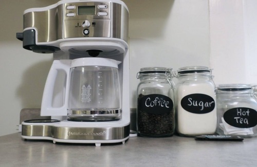 * drip coffee machine that can do a big pot or a single cup (no k-cups), and stocked with coffee beans, coffee grinder, sugar, and also hot green tea packets