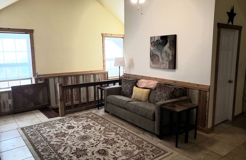 Discover this enchanting 1-bedroom gem in Bastrop. This awesome King Suite features a cozy living room with a sofa bed, perfect for relaxing after a day of exploring. The bedroom boasts a tremendous king bed for a restful night's sleep. With WiFi, heating, and AC, this charming space has everything guests need for a comfortable stay. A great place to call homebase while you're away, we hope you enjoy your stay..