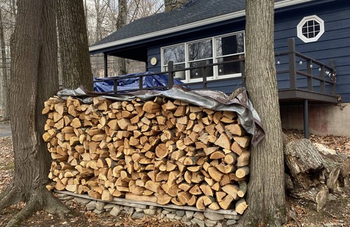 The quintessential dog friendly Lake Wallenpaupack getaway! Cozy blue cabin close to the lake! This is a lake view cabin that is a very short walk to the lake.
