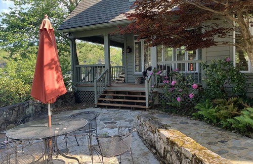 the guest house just steps away includes a king bed with a full bathroom and screened in porch