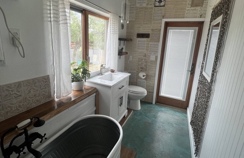 Romantic tiny home with unique features like the horse trough bathtub and outdoor shower. Outdoor seating, a fire pit and access to the swimming pool and Cabana at the main home. The retreat is on the wine and Brewing Trail in Hill Country. Conveniently located five minutes from town/Dripping Springs and only 30 miles from Austin. This is the perfect combination of luxury and nature. Horses on the property, as well as other wildlife and our adorable mascot Dolly, the potbelly pig. Perfect get away for a couple to relax and rejuvenate. The pool will be open in late April..