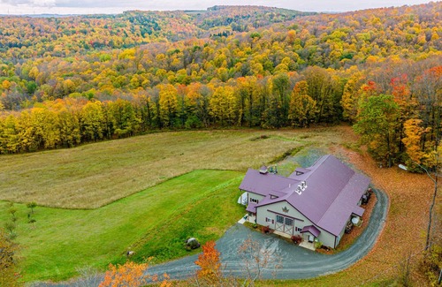You will instantly feel at peace in our secluded, quiet lodge. Our custom timber frame home is stocked with comfortable linens, a full kitchen, and the pure golden goodness of our maple syrup. We sit at 2000 feet of elevation, giving us one of the most breathtaking views in the Finger Lakes area.