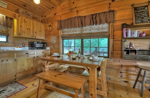 This romantic cabin rental is situated in the heart of Ellijay, overlooking the awe-inspiring North Georgia Mountains. The Cozy Mountain Cabin offers a serene retreat amidst the tranquility of nature, perfect for a weekend away or longer in the Blue Ridge Mountains. This pet-friendly haven boasts ample outdoor living space, where you can unwind on the gated deck's rockers or snuggle up with your loved one in the cushioned double swing. Fire up the gas grill and savor the flavors of a mountain barbecue, with burgers or fresh trout caught from nearby rivers and creeks.