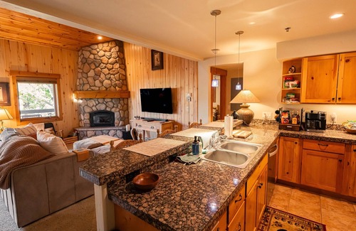 Gather around the beautifully crafted stone fireplace with friends and family after a long day on the slopes or relax in our two hot tubs to soothe your aching muscles. This centrally located condo is on the free Steamboat bus route and only 3 stops away from the ski resort or downtown. Shop for supplies and groceries at Walmart, City Market, or Christy Sports, all located directly behind the property and connected via a paved walkway. Enjoy a movie night with friends on the streaming-enabled TV, catch up on social media with gigabit wifi, and sleep well in our cozy queen beds before your next big adventure. The peak of Quarry Mountain is visible from the outdoor covered patio; a great place to enjoy a morning coffee and soak in the sounds of the quaking aspen trees around you. Watch the mountains transform in every season from this beautiful, cabin-inspired condo in the heart of Steamboat!.