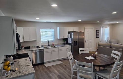 a blend of comfort and style greets you as you enter our newly built ranch home We have worked hard to create a home away from home feeling for our guests. The open-concept floor design allows room for many guests. Everyone in your group will have room to mingle and relax.