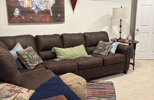 With a Hwy 66 theme living room, the most comfortable sectional sofa beckons you to take a load off! In this room, there is a tv stand loaded with games and puzzles, and of course a 47" high definition TV. A kitchenette includes a full size fridge with freezer, a Keurig coffee maker, a table top oven / air fryer, a microwave - and all the tools you'll need to meal prep between adventures! We've spared no expense - luxury linens on the Sleep Number bed with a large corner desk plus 32" TV. If you've brought more than just your sweetheart, that sectional sofa is a queen size sleeper so there's plenty of room for everyone.