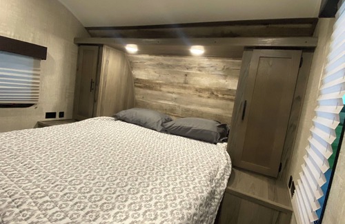 Escape to a serene retreat just 8 minutes outside of Muncie with this cozy 2-bedroom recreational vehicle. Guests can unwind in a fantastic space equipped with WiFi, AC, and heating. Book now and experience the welcoming ambiance of this unique property. The camper is on a personal property, but you will have complete privacy..