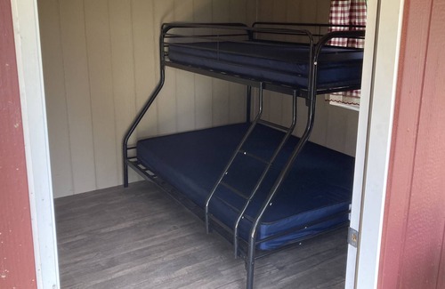 This little solar Bunkie cabin is nestled along our tree line our quiet campground the Bunkie is a 10x10 one room cabin has a double on bottom bunk bed single on top also has a small and cozy loft great place for the kiddies to sleep as the loft offers 2 single mattresses ,The washroom/Showers/ laundry room are only steps away the solar cabin comes with a propane BBQ and firepit, So come sit back and enjoy yourself..