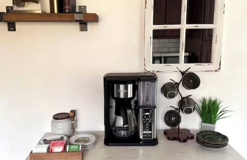*coffee station with coffee machine, milk frother We provide ground coffee, tea, hot cocoa, mini creamers, sugar sachets.