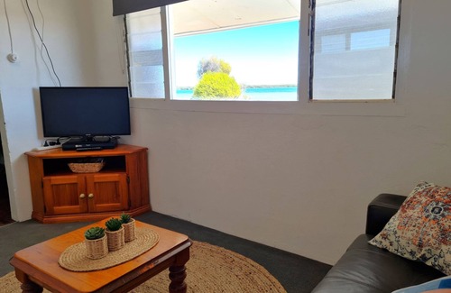 property details: 1 bedroom - queen Sleeps 2; Quilts, blankets and pillows provided – BYO sheets, pillowcases, towels, bathmats & tea-towels OR optional linen hire $30 per person available through Country Getaways office. Small bathroom with walk-in shower and vanity; Hairdryer; Separate toilet. Reverse cycle split system air-conditioning in central kitchen; Ceiling fans in lounge and dining room. Bedroom has wall-mounted television. Sofa seating in lounge room with seaviews; Television; DVD player; DVDs; Books; Board games. Well-equipped kitchen with gas oven and stovetop, microwave, and large fridge with freezer on top; Coffee and tea making provisions; Kitchen appliances including kettle, toaster and electric frypan; Large dining table. Top load washing machine; Iron; Ironing board; Clotheshorse; Rotary clothesline in yard. Undercover entertaining area at front of house overlooking beach; Outdoor dining table with seating; Flat plate gas barbecue. Fenced rear yard; Outdoor shower. Fish cleaning sink. Beach access directly in front of house. Carport parking for 1 small car (1.8m height clearance); Off-street driveway parking for a car or boat. Pets by arrangement only ($100 refundable bond applies per pet) - inside pets accepted.