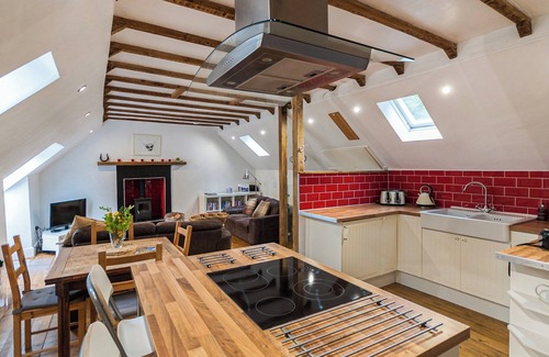 kitchen area: breakfast bar, electric oven, induction hob, microwave, fridge/freezer, washing machine