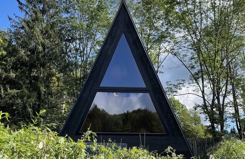 glamp on the charlotte creek in a newly built modern tiny a-frame Sleep under the full moon. A giant moon light hangs over the bed(s) with a stunning reflection in the window at night over the creekview. Perfect for a romantic getaway, fishing trip, or glamping spot with friends in the Catskills. There’s a private driveway on site.