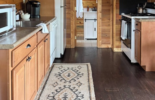 newly renovated 1930’s historic barn with all the modern amenities you could need Features a fully stocked kitchen and comfortable living room. A dining table with seating for two and a fully furnished kitchen with all the basics is also available for your convenience.