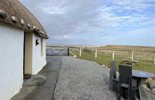 amenities: electric storage heating with electric wood burner effect stove Electric oven, grill and hob, microwave, fridge, freezer, washing machine. TV with DVD, radio and CD player, WiFi, selection of DVDs and CDs. Fuel and power inc. in rent. Bed linen and towels inc. in rent. Off-road parking. Wrap-around gardens with gravelled area, patio, shed furniture. Pet-friendly. Sorry, this is no smoking property. Shop 3.2 miles, pub 4.6 miles. Note: Though electricity is included in the rent, electric for charging cars is not included in the rental. Note: Local road signs use the Gaelic name in large letters with the English name in smaller letters underneath Note: Please do not have barbecues at the property due to the risk of sparks to the thatched roof. note: please bear in this mind this property is located on an island and therefore only accessible by plane or ferry