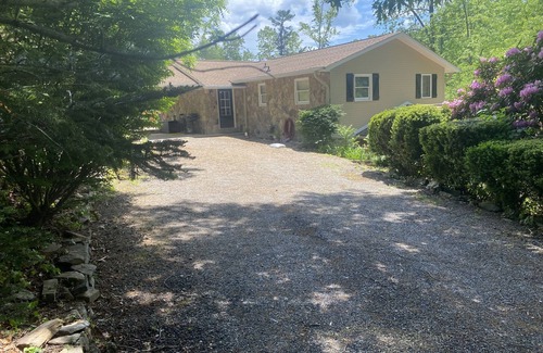 This home is nestled away In WNC just 10 miles from the Highlands in NC, surrounded by rhododendrons, mountain laurel and directly on the Cullasaja River. Limited views of the mountains on the property but half a mile down the road they are in an abundance . The living room has comfortable seating along with a electric fireplace and smart TV. There is a game-room with an arcade and a pool table with a play area for children as well as a large den downstairs. Sit on the backporch while listening to the river and watch the fly fishermen bring in the trout. Sit by a nighttime fire down by the river or enjoy our gas fire pit on the back porch. The hot tub is truly the highlight .Our spacious floor plan offers a open kitchen and living room . The kitchen has service for 12 and you will be able to find all you need from a Ninja Blender to a Kurig . Come enjoy our centrally located cabin so close to so many mountain attractions .