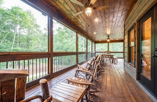 just outside on this level is a large screen porch with an oversized hickory dining table with seating for 10 or more The porch has handcrafted Amish rockers that are incredibly comfortable for hours of relaxing or talking. Back inside, the bedroom on this floor is furnished with handmade aspen log furniture. It has a walk-in closet and private covered deck that has excellent views of the waterfalls on the left side of the house. This floor has an oversized marble shower with the finest appointments.