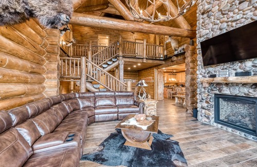 challenge your guests to some friendly competition in the downstairs game room equipped with a smart tv and a 2-in-1 pool/ping-pong table Floor-to-ceiling windows in the great room showcase strong natural lighting and stunning views, with lofty cathedral ceilings creating an airy ambiance accented with warm, wood finishes. After the day's adventures, unwind beside the gas fireplace while streaming shows and movies on the smart TV. Showcasing a gorgeous backsplash and counters, the island kitchen comes well-equipped with a suite of chef's-grade appliances designed for gourmet meals including a five-burner gas range and dishwasher. Complete meals can be enjoyed together at the gorgeous wood-hewn dining table set for 12.
