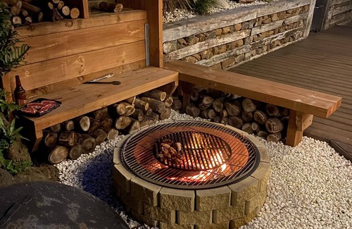 outside there is a front deck with table and chairs with an elevated view over trees and there is a private under cover patio area out the back with table and chairs, firepit with grill over the fire for those juicy steaks and bbq Outdoor areas are quiet and peaceful. Back garden is secure and fully enclosed and suitable for dogs.