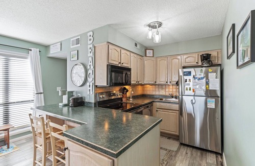 step inside to the spacious living area, where you'll be greeted by light, airy décor and plenty of natural sunlight streaming in through sliding glass doors A queen-sized sofa is provided for additional accommodations. Start your day with a cup of coffee on the porch, taking in a spectacular Outer Banks sunrise over the ocean, or unwind with your favorite beach read while listening to the soothing sound of the waves. The modern kitchen has stainless steel appliances, including a stove and dishwasher, making meal prep and cleanup a breeze. The dining area, with comfortable counter stools and easy-to-clean vinyl flooring, is perfect for enjoying meals together. As you pass through the hallway, you'll find the cozy Daybed Nook, an ideal spot for kids to have their own space while staying close to the family. They’ll have convenient access to the full hallway bathroom. The King Master Bedroom is a peaceful retreat with fresh, cozy bedding, a flat-screen TV for entertainment, and a private en-suite bathroom with a shower, tub, and all the comforts you need.