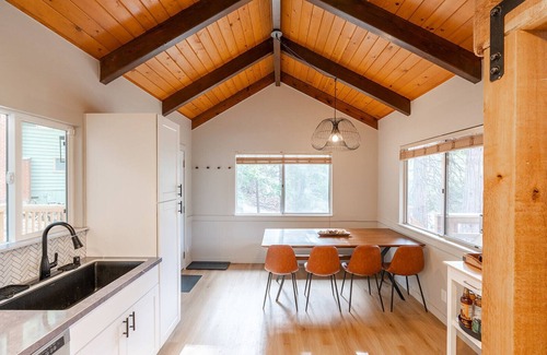 deer run cabin is a newly renovated sun-filled space with floor-to-celing windows in the main living room, a dining room, kitchen, and 3 bedrooms with 2 full bathrooms The basement has two lounge rooms, perfect for movies, game night, or a teenage video game hibernation station. Outside, the front deck and giant patio deck allow you to enjoy the great outdoors.