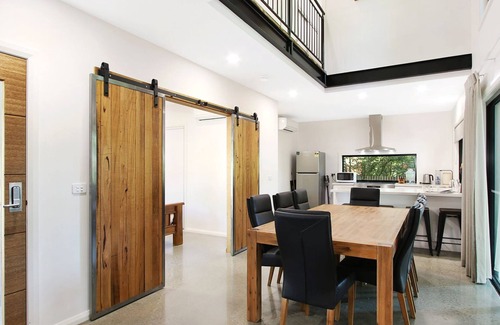 Beautifully designed in every detail, the central atrium gives a remarkable sense of space, while windows perfectly placed provide plenty of natural light and a green, leafy outlook. The large L-shaped leather lounge takes advantage of a wood heater for those cosy Winter nights, while the large upper deck gives a perfect platform for lazy Summer nights amongst the large, green leafy trees.
