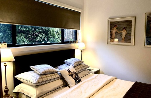the queen-sized bedroom has a wardrobe & adjacent bathroom Also, smart TV, Wi-Fi, electric blanket, ducted heating, books and magazines plus sensor lighting for late-night homecomings.