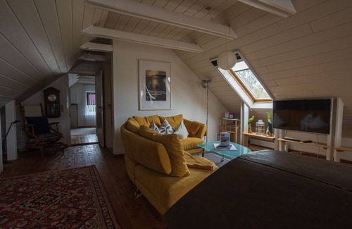 the apartment is located on the upper floor of our detached house and has its own entrance access to the garden, or
