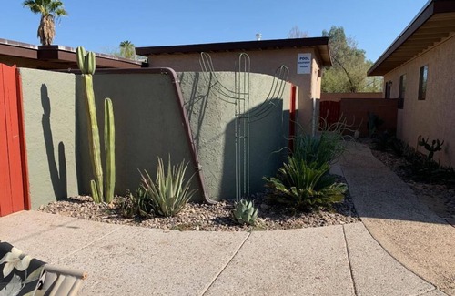 State Tax #21272215 This is a smoke free property. Convenient location, near midtown Tucson. Casita G (830sf) is part of a 15 unit apartment complex where all units are situated around a pool. It has a fenced in yard for privacy and carefully chosen furnishings for your comfort and enjoyment. Both bedrooms have king size beds with linens and coordinated decor, the living room has leather furniture, a flat screen tv, and the kitchen is fully stocked with cooking and dining utensils. A washer and dryer are located in the casita as well. The property is centrally located to all of Tucson's tourist attractions, the University of Arizona and area hospitals. We do provide free secure parking in our gated parking lot for one car per casita. All parking is in assigned parking spaces. Traveling with a second vehicle, they are able to park on the street outside the complex, or if available we do have a few additional parking spaces for rent at $10 per night extra. Dogs up to 60 pounds allowed provided they are not a 'pit bull or pit bull mix', do not bark, and are not left in the unit alone unless crated. There is a limit of 2 dogs per unit. no other types of pets are allowed!