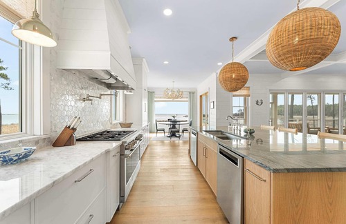 inside, the home is thoughtfully designed for relaxation and connection Vaulted ceilings and expansive picture windows flood the living spaces with light and create a seamless transition to the outdoors. The gourmet kitchen, equipped with premium appliances and generous prep space, is perfect for both casual meals and elegant dinners. Sink into the oversized sofas in the open living area or sip wine by the fireplace as the sun sets over the Bay.