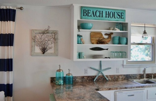 the interior was professionally remodeled & decorated with beach inspired furnishings There are 3 bedrooms & 2 1/2 bathrooms. One bedroom with a king bed, another with a queen bed, & a bunk room with two sets of bunk beds, sleeps-4 (perfect for children or adults). There is a locked storage underneath the house where there is a full bath with an enclosed shower, toilet and sink (perfect for rinsing off after a day at the beach) & washer & dryer.