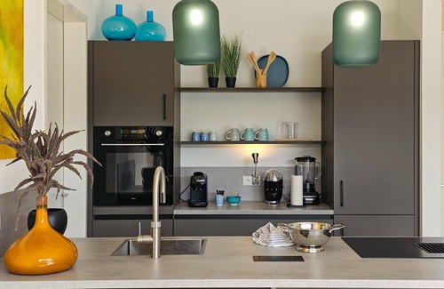 the open kitchen is fully equipped with, among other things, a combi-oven blender, nespresso machine, quooker, citrus press, fridge with freezer compartment and sufficient crockery and cooking utensils At the kitchen island with bar stools, cooking becomes a cozy get-together. The kitchen flows seamlessly into the bright living room with a ceiling fan, a lovely L-shaped sofa, flat screen TV, JBL Boombox and large sliding doors that give access to the terrace and let in lots of natural light.
