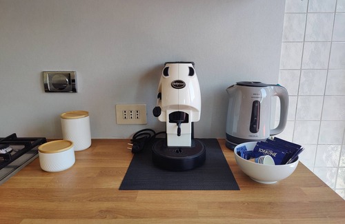the kitchen is equipped with an oven, a stovetop, and a refrigerator, as well as a coffee maker, an electric kettle, and cookware Bathroom amenities include a hair dryer, a bidet, and towels. Other amenities at this 1-bedroom, 1-bathroom rental include bed sheets, air conditioning, and heating.