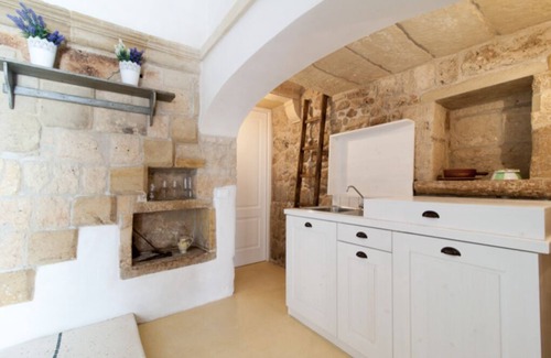 The historic Nonna Lucetta residence is located in a characteristic pedestrian street a few steps from the medieval Castello Dè Monti in the characteristic town of Corigliano D Otranto. The house is part of a typical courtyard house, that is, an independent residence overlooking the common atrium "court", in a romantic and reserved setting suitable for reviving the atmosphere of the past. The dwelling respects the architectural techniques of the time with the ceilings characterized by the star shaped vault in Lecce stone, and with a large fully functional fireplace. From the bedroom you can access a small private outdoor patio. The completely historic furniture has been finely restored preserving the typical Salento characteristics, allowing guests to immerse themselves in the most intimate and splendid local tradition. It has a comfortable double bed, kitchenette furnished with everything you need, fridge, large private bathroom with comfortable shower, air conditioned environment, hairdryer, courtesy line, TV..