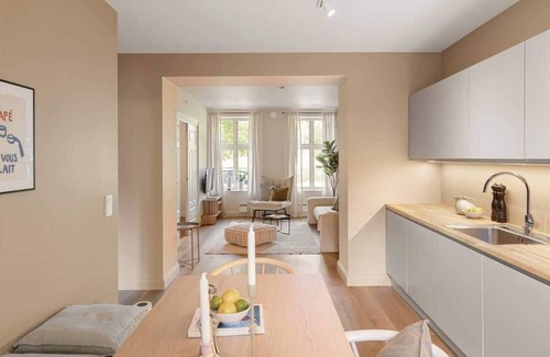the building dates back to the 1800s, and during the restoration, great emphasis was placed on preserving its historical charm with original details and replicated windows from the construction period The apartments feature oak parquet floors, Huseby kitchens, elegant bathrooms, and are furnished in a modern Scandinavian style. When you enter, you will use original stairs and handrails that have been well-preserved for nearly 150 years. All apartments have either a spacious balcony, a private rooftop terrace, or access to charming seating areas in the lush and secluded backyard. Here you will experience "Quiet Luxury" and the perfect combination of past and present.