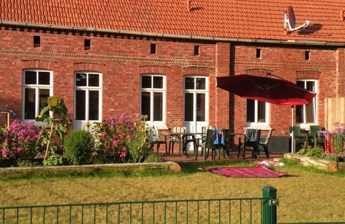 Dirkshof 2 West Rodenkirchenerstr. 1 26316 Varel near Nordseebad Dangast, a beautiful apartment in a 100-year-old manor house on a more than 10,000 square meter park-like property with a garden and old trees. The property is on the outskirts of Varel. The pedestrian area with shops, cafes and restaurants can be reached on foot in 10 minutes. A drinks market is in the neighborhood, as is the indoor pool and a sports field. The North Sea resort of Dangast is around 8 km away and it is around 3 km to the port of Varel. Dirkshof 2 West ideal for - group travel - approx. 200 sqm, single storey, barrier-free, wheelchair accessible. An apartment for 12 to 15 people, friendly and modern furnishings. Large terrace with garden furniture and grill, approx. 300 sqm fenced garden with sandpit. Utility room with washer and dryer. If required, the following additional equipment can be provided: children's beds, children's chairs, patient bed, wheelchair, toilet shower chair, additional mobile handle.