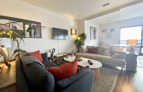a sofa bed, air conditioning, and a desk are featured at this 3-bedroom, 2-bathroom rental Bathroom amenities include a hair dryer, towels, and toilet paper. The kitchen is equipped with an oven, a stovetop, and a refrigerator, as well as a coffee maker, an electric kettle, and a microwave. And you can even pack a bit lighter because there's a washer and dryer. Other amenities include bed sheets, a desk chair, and a dining table.