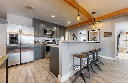 when you need a break from the sun, relax in the roomy living space that hosts rich leather sofas and fun pops of color Cooks will enjoy preparing family meals in the well-established kitchen with bar seating. When mealtime rolls around, enjoy gathering for meals in the dining space that overlooks hill country views. The cottage's bedrooms are equally comfortable and kept cool thanks to the home's air-conditioning. Additional perks found within include a private washer/dryer and internet access.