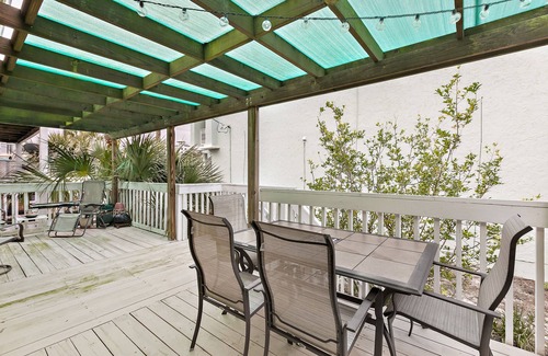 find yourself in this cozy, single-level getaway with a wall-to-wall bohemian beach vibe Perfect for a couple or a small family thank to the inclusion of a queen-size sofabed, this darling townhouse boasts a galley-style, full kitchen, a dining table for four, and an inviting living area with a wall-mounted, cable-equipped flatscreen TV. Outside on the front porch, cool off after days at the beach and listen to the breeze rustling the palms, or head to the covered back deck with a table and chairs - a great place for al fresco dining.