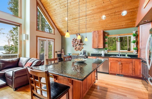 inside, the home's first floor has an open concept seamlessly combining the living area and eat-in kitchen Vaulted ceilings and floor-to-ceiling windows allow endless natural light in as well as marvelous views of the bay. Snuggle up in front of the gas fireplace and stream a favorite show on the large smart TV. The gorgeous kitchen is a cook's dream, with all stainless steel appliances and a four-person island for family meals. This floor is also home to the main bedroom, which has a comfortable bed and a private two-person soaking tub, a large private deck overlooking a wooded area, and an en suite full bathroom.