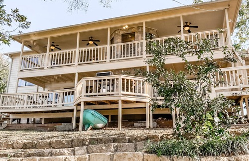 bright, family-friendly, and fun, this riverside getaway is the perfect home away from home in seguin—one of the oldest towns in texas! inside this two-story vacation rental, you'll find a well-equipped kitchen with stainless steel appliances, loads of counter space, and a breakfast nook Enjoy more formal meals in the dining area with seating for six, and then settle in for movie nights in the nearby living area. Downstairs, you'll find a spacious rumpus room with an additional wall-mounted flatscreen TV and viewing area; a long counter with seven stools; two tables for lunches, snacks, or board games; a Ping-Pong table; and easy access to the lower-level deck. Outside, fire up your gas grill, relax on the upper or lower-level deck, dine by the water's edge, or fish from your very own dock.