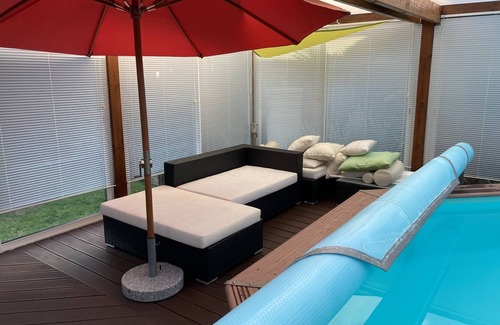 while you're here, you can enjoy all the comforts of home and more, including a pool and free wifi, as well as a garden and a private deck Other amenities include laundry facilities, towels, an ironing board, and a desk.
