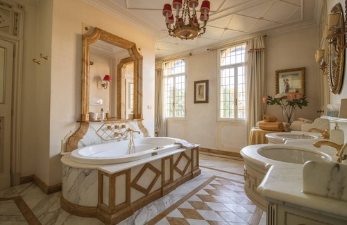 as you settle into this 7-bedroom, 45-bathroom rental, you'll find a living room, a fireplace, a safe, and air conditioning. In addition, there's a jetted tub, along with a bidet, shampoo, and soap. The kitchen is equipped with an oven, a stovetop, and a refrigerator, as well as a coffee maker, an electric kettle, and an ice maker. And because there's a washer and dryer, you can go a bit lighter on your packing.